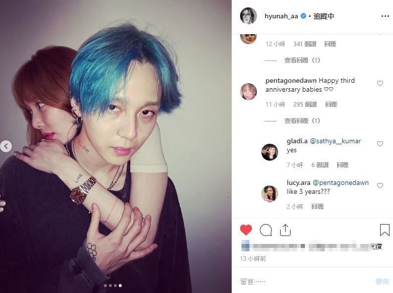 韓國女星泫雅和E’dawn金曉鐘,去年8月公開3年秘戀,揮別舊東家Cube娛樂後,今年1月終於確定加入Psy江南大叔新成立的公司P Nation,讓外界相當期待兩人回歸樂壇的日子。而近期泫雅和E’dawn的IG動作更是頻繁,9日,兩人一同開通微博,高人氣的他們立刻登上陸網熱搜,同日適逢兩人交往3周年,泫雅在IG曬出多張親密照,不論對兩人和粉絲來說都是一樁喜訊。