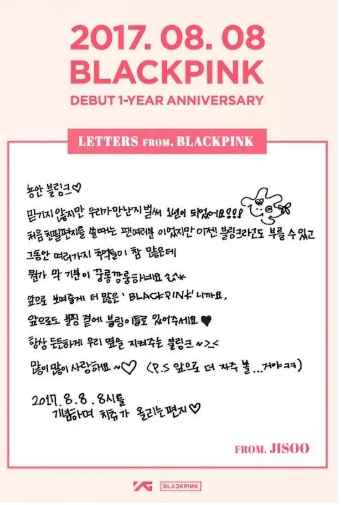 BLACKPINK成員Jisoo在綜藝節目中古靈精怪的個性深得粉絲們的喜愛,而她在出道一年寫給粉絲們的信中,字體被粉絲大讚「好可愛」,除了字體本身就可愛之外,她還畫了一些表情符號或顏文字,讓整封信給人甜美的感覺,就如同她精緻的長相一般,讓粉絲完全傾倒於她的一切。