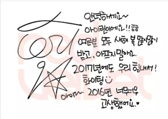 韓國偶像除了本身必須具備唱歌跳舞的實力,下了台後還得與粉絲們進行互動,像是開直播、或參與簽售會。偶像的一舉一動都是粉絲關心的話題,在簽售會上,偶像通常會寫些感謝的話祝福粉絲,與粉絲拉近距離。因此,偶像字跡是否好看也是身為偶像的條件之一,以下細數字跡好看的偶像們。