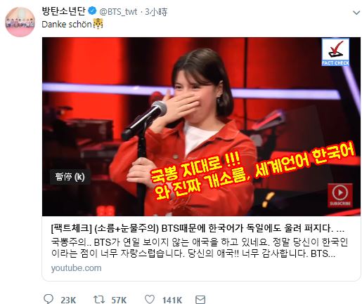 即便BTS已經揚名全世界,不過仍時常能在公開或私下直播的場合中,看見他們對粉絲表達感謝,9日,更在團體的官方推特轉發一名德國女孩Evelynes Auftritt,在歌唱選秀節目《英國兒童好聲音The Voice Kids》演唱防彈少年團去年6月發行的專輯《Love Yourself 轉 'Tear'》中的抒情歌曲《The Truth Untold》,更在文中以德文向該位阿米(BTS 粉絲名)說到「謝謝」,並附上「老虎」貼圖顯示是團員V的留話。