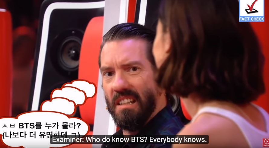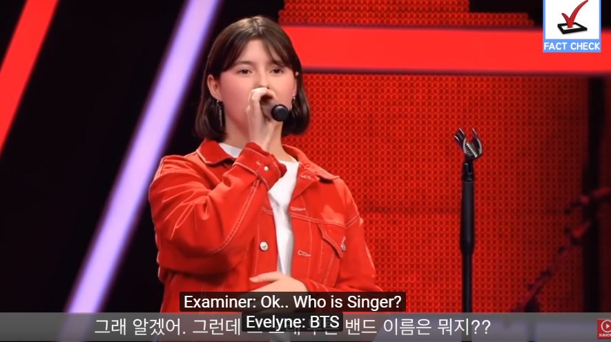 事實上,該位德國女孩Evelyne年僅14歲,初次登上「兒童好聲音」自彈自唱BTS的歌曲時,評審團都露出疑惑表情更猜測到「這是西班牙文,還是義大利文」。不過Evelyne的演唱還成功讓兩位導師「轉身」,節目中也向外界透露因為喜歡韓國文化「所以自學韓文」,也向評審表示歌曲原唱者是BTS,而女評審問起一旁男導師「你知道BTS嗎」,男導師還回應「大家都認識啊」也解釋不少女粉絲因此而勤學韓文。