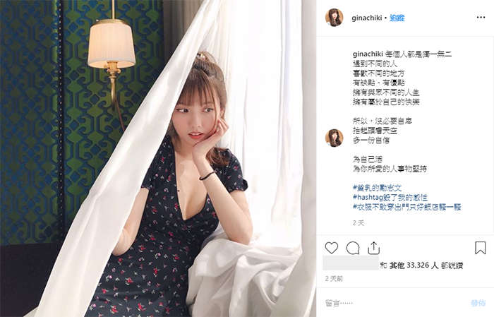 近日Gina在IG中發布一張身穿低胸洋裝的照片,只見照片中的她領口開得超低,性感的雙峰呼之欲出,她也打上:「每個人都是獨一無二,遇到不同的人,喜歡不同的地方,有缺點、有優點,擁有與眾不同的人生,擁有屬於自己的快樂。」有感而發地和大家分享心靈雞湯,鼓舞粉絲們不需要自卑,要有自信地為自己而活、為所愛的人事物堅持!