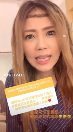 Sandy日前透過IG限時動態回答粉絲,關於保養品、化妝品的問題,引起許多粉絲熱烈回應,而Sandy也細心的一一拍影片回覆,其中有網友問道:「想知道化起來自然無妝感的粉底,但要遮瑕效果好的」,Sandy也直接了當的說:「有自然的粉底、也有遮瑕好的粉底,但要兩種都有,世界上真的沒這種東西!」甚至還有網友希望她分享化妝台上有些什麼東西,她也搞笑地回應:「報警處理你!我真的沒有化妝台你信嗎,我要哭惹」。