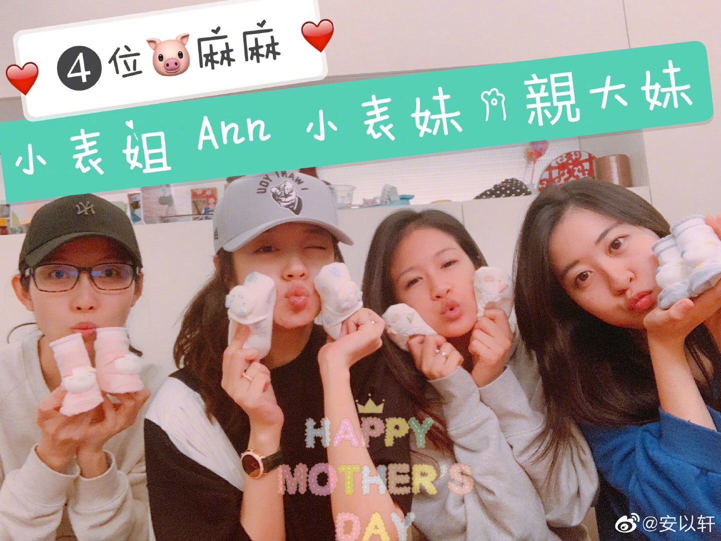 在照片中,安以軒和懷孕中的表姐、表妹、親大妹一起曬出小孩子的小鞋,共同拎著小鞋合照,大家共同嘟嘴,表情超級可愛。拎著藍色小鞋的親大妹、小表姐也拎著粉色小鞋,3位姐妹一同度過人生中第1個母親節,並瞭解到,懷孕後才真正體會到當媽媽的辛苦。手中的花束,則是老公代替未出生「66」提早送給她的,十分貼心。