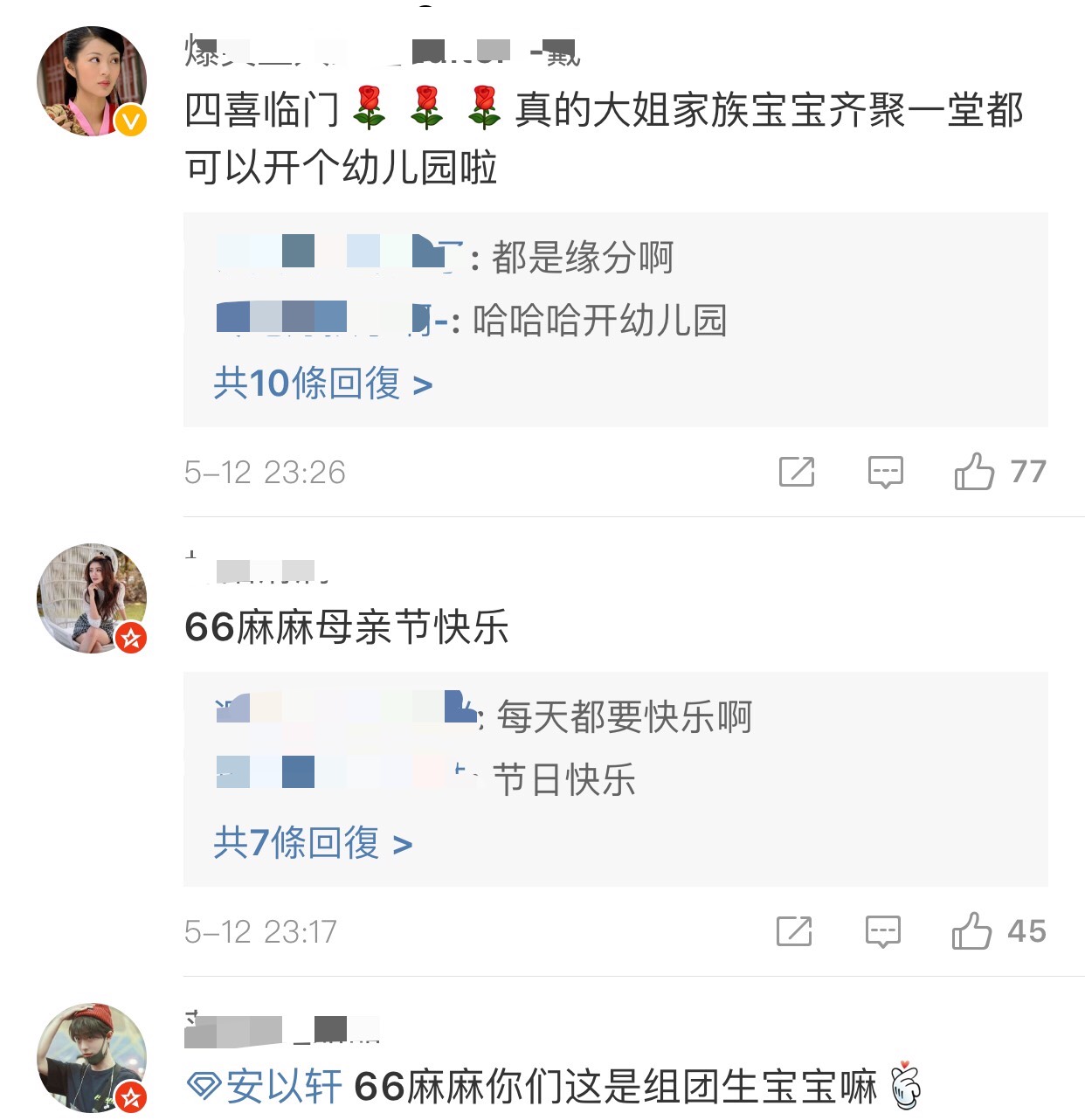 夫妻兩人甜蜜的閃瞎眾多粉絲,安以軒也說:「以後家族會更熱鬧,懷孕後才真正體會做媽咪的辛苦,每個辛苦又偉大的媽咪,母親節快樂!」四喜臨門為今年的母親節顯得更有「孕」義!許多粉絲說:「這是組團生孩子嗎」、「好孕會傳染,祝福幸福滿滿」,也希望自己能沾沾好「孕」氣並祝福第一次過母親節的安以軒母親節快樂!