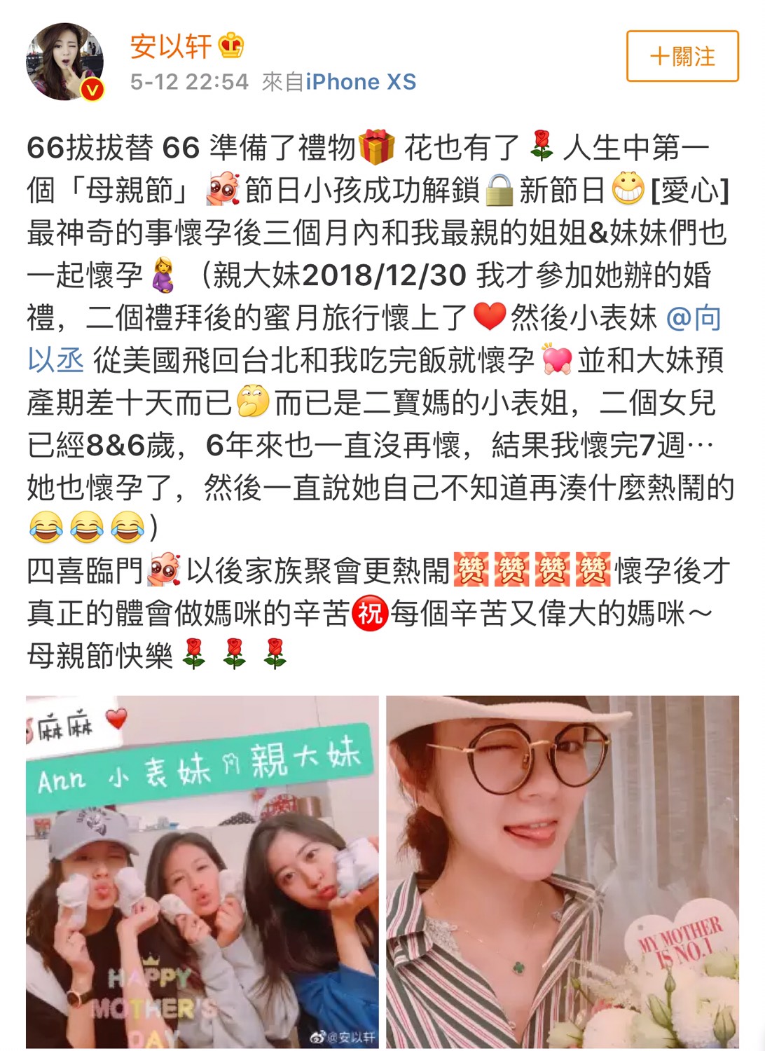 安以軒在微博曬出老公送的花,同時也貼出和親大妹、小表妹、小表姐的合照,分享她覺得最神奇的事:「表示懷孕3個月的期間,3個最親的姐妹一同懷孕了!」原來在2018年12月30號參加了親大妹的婚禮,隨後在蜜月旅行時懷孕,同時緊接著小表妹向以丞從美國返台和安以軒餐聚後就懷孕;就連已經是二寶媽的小表姐,也在安以軒七週時懷孕。安以軒笑說:「我懷孕七週,她也懷孕了,然後一直說他自己不知道在湊什麼熱鬧的。」