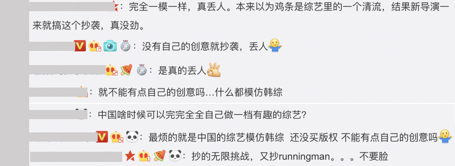 網友紛紛在該則貼文下方留言表示:「抄的無限挑戰,又抄runningman,不要臉」、「最煩的就是中國的綜藝模仿韓綜 還沒買版權 不能有點自己的創意嗎」、「中國啥時候可以完完全全自己做一檔有趣的綜藝?」、「就不能有點自己的創意嗎…什麼都模仿韓綜」、「是真的丟人」、「沒有自己的創意就抄襲,丟人」,網友們對於節目抄襲感到相當不滿,更是覺得非常丟臉。