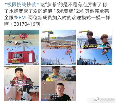 《極限挑戰》第五季在昨日晚間播出第一集後,有網友在微博上發文稱:「《極限挑戰5》在新成員開場環節被置入集裝箱內的內容,與2017年4月16日播出的韓國綜藝《Running Man》十分雷同」,除了將「水炮」改為「愛的泡泡」且尺寸從15米變成12米之外,其他幾乎與《Running Man》一模一樣,疑似構成抄襲,消息一出也瞬間登上微博熱搜榜上。