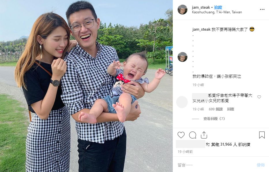 牛排昨日在IG中上傳一張和妮妮的合照,可以發現兩人還穿著情侶裝,牛排上衣搭配黑白格子襯衫,妮妮則是穿著黑白格子的長裙,大方放閃。不過這張照片中,牛排竟抱著一個爆哭中的小北鼻,他更打上:「我不要再隱瞞大家了」,因為正好是母親節,讓人乍看之下以為他要分享喜訊,怎料他接著話鋒一轉:「我的爆帥症,讓小孩都哭泣」,不改說幹話的風格。