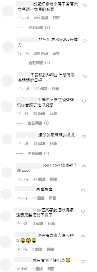 照片上傳之後,網友則紛紛留言:「感覺好像老來得子帶著大女兒跟小女兒的感覺」、「嬰兒無法承受300磅握力」、「不要跟我543啦 什麼時候讓妮妮變母親」、「牛排你不要在逼寶寶跟你合照了他很驚恐」、「You know 這個親子裝 cool」、「你這笑容配這眼鏡讓這嬰兒整個就不爽了」。
