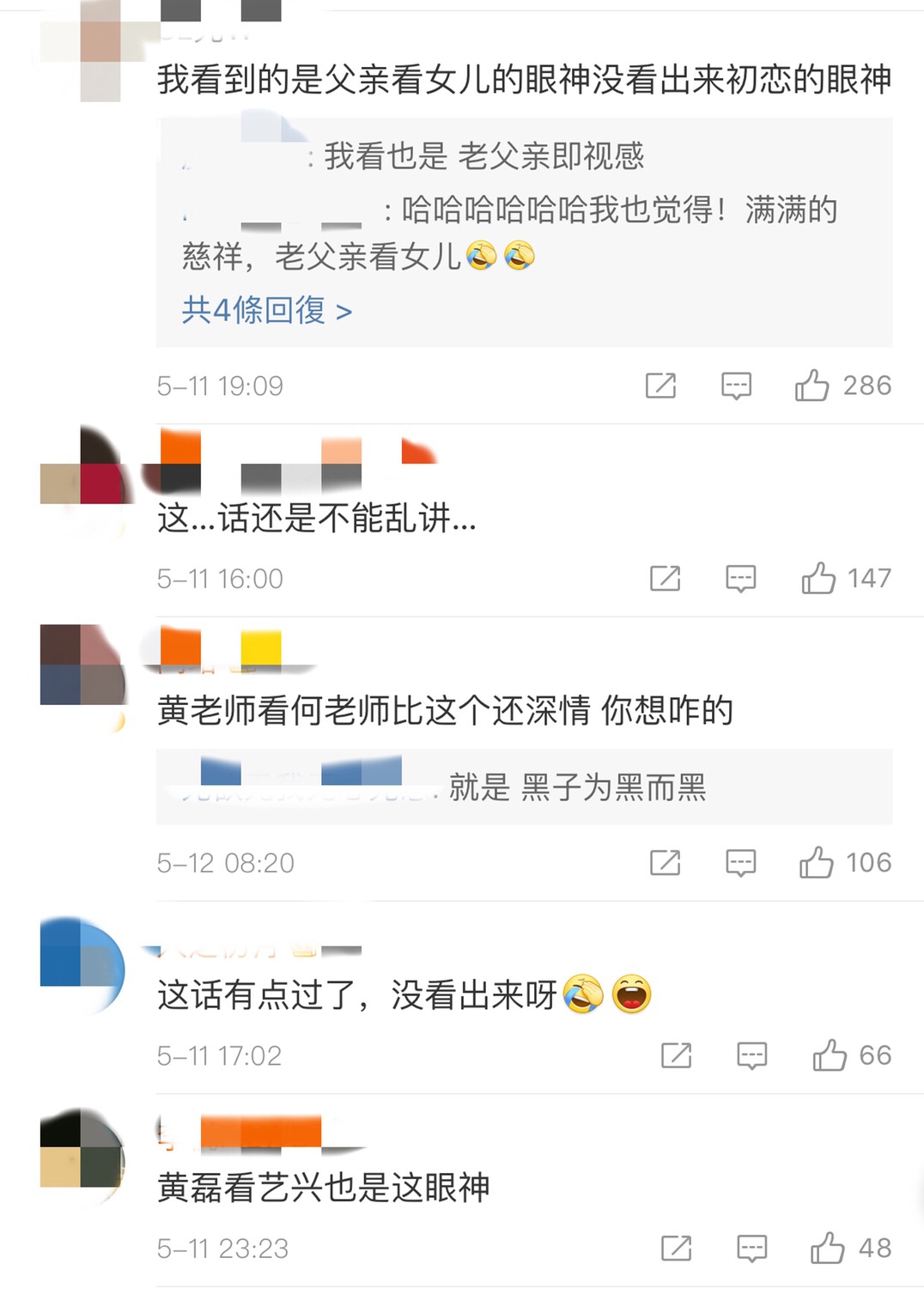 之後玩遊戲時,張鈞甯搞不懂遊戲規則,黃磊伸手去拉她,她很自然的反手拉住黃磊的胳膊,一邊繼續和何炅玩遊戲,兩人看起來就是手拉手的模樣。除此之外,網友也認為黃磊看張鈞甯的眼神很曖昧,「眼裡都是滿滿的愛」、「黃磊看張鈞甯的眼神彷彿看到了初戀」,但也有網友表示,「黃磊看誰都這樣吧」、「這是爸爸看女兒的眼神啊」、「黃老師看何老師比這個還深情」、「黃磊看藝興也是這眼神」。