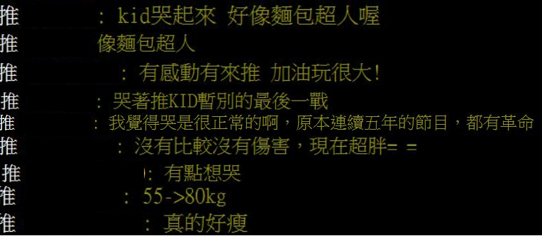 上週播出的《玩很大》是KID入伍前的最後一集,一行人來到綠島拍攝,在綠島的最後一夜,所有人坐在長椅上聊天,工作人員播出KID在《玩很大》中的回顧,KID也在現場真情流露,甚至一度哽咽說不出話,哭倒在吳宗憲懷裡,雖然網友們看了也跟著泛淚,但還是忍不住笑說:「KID哭起來好像麵包超人喔!」