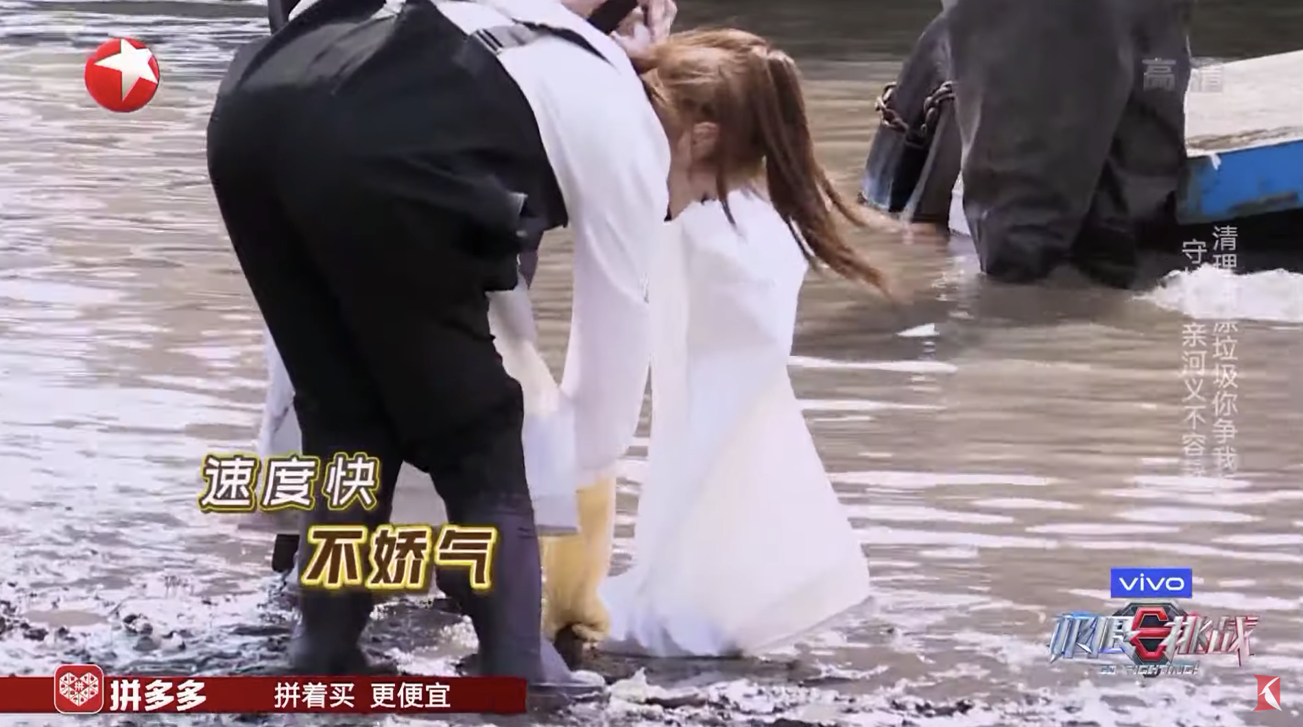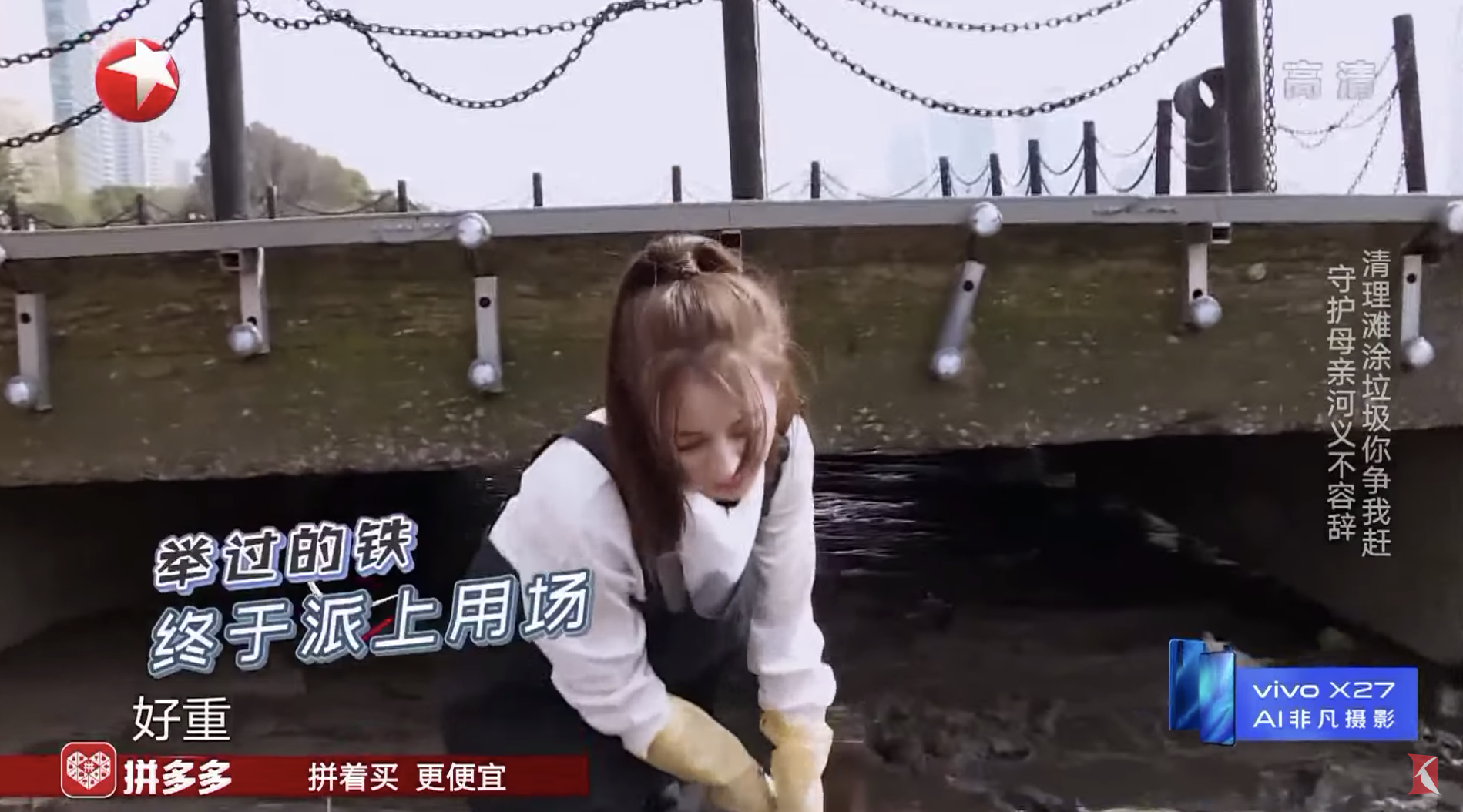 其中有一個挑戰環節是在20分鐘內要在黃浦江畔的淤泥地清理垃圾,哪一隊撿的垃圾重量最重就獲得勝利,一行人換上雨鞋以及防水的套裝,開始前往淤泥地清理垃圾,迪麗熱巴相當敬業的彎下腰不斷拾取垃圾,更前進低矮的橋下清理,一大袋滿滿的垃圾也是親自搬運,完全沒有任何女神的傲氣,讓一旁的羅志祥也對她刮目相看,節目組更在畫面旁邊打上:「速度快、不嬌氣」的字樣,也讓網友們紛紛在留言區大讚迪麗熱巴:「熱巴真的是人美心善,女神」