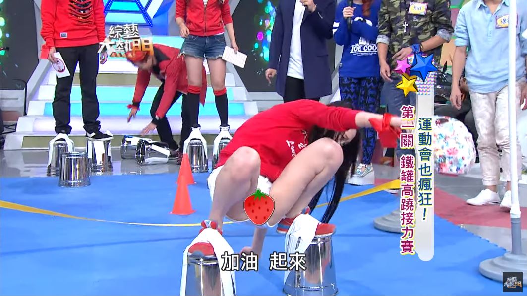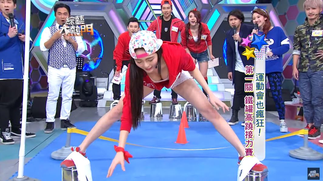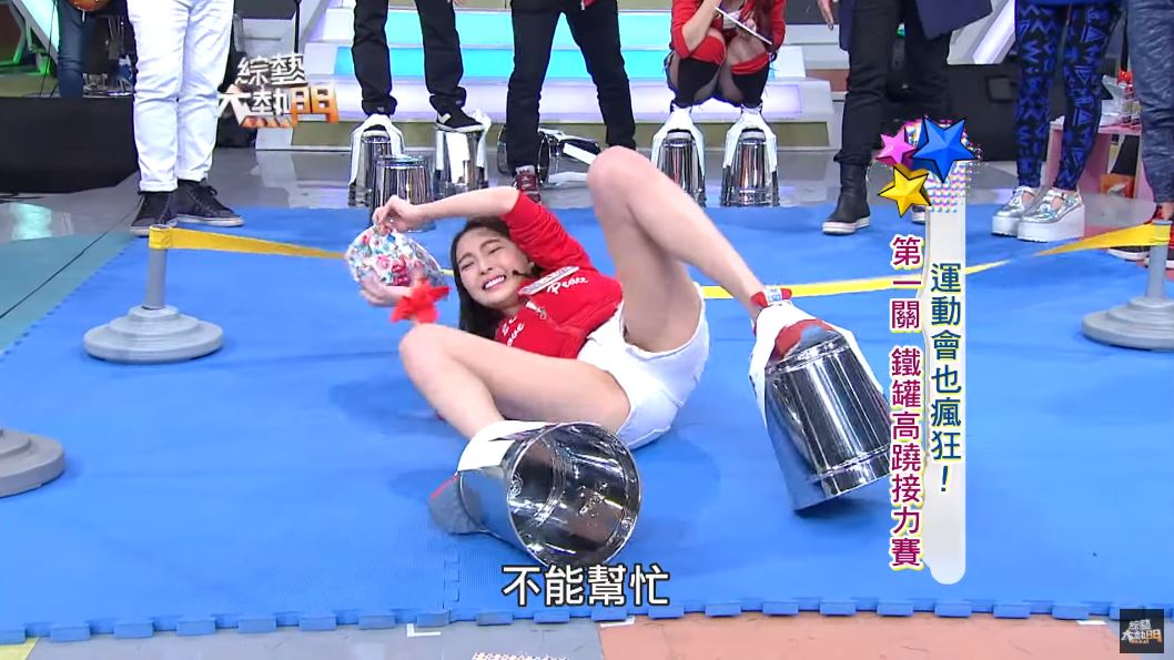 《綜藝大熱門》近日釋出經典回顧影片,當時的主題是「運動會也瘋狂」,來賓必須把鐵桶綁在腳底,用「踩高蹺」的方式輪流下腰跳凌波舞通過阻礙。當時黃沐妍穿著白色超短熱褲,上半身則穿著低胸小可愛,不過卻因為太心急,整個人摔個四腳朝天,雙腿大開跌坐在地板上,這一幕全被攝影機拍了下來。