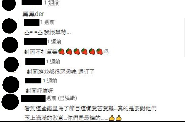 網友們看了紛紛直說:「黑黑der…」、「我恨草莓」、「封面遊戲都很惡趣味」、「封面好壞啊」、「挑這種封面放你們真的很夭壽…」,也網友直說:「看到這些諧星為了節目這樣受苦受難…真的是要對他們致上滿滿的敬意」,最後也對他們喊話:「你們是最棒的…」。