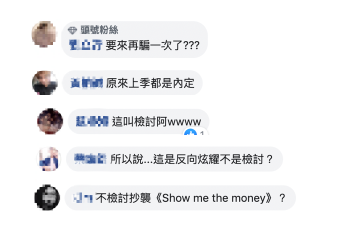 然而網友看見這份檢討報告後,紛紛留言表示:「所以說...這是反向炫耀不是檢討?」、「不檢討抄襲《Show me the money》?」、「這叫檢討阿」、「要來再騙一次了?」、「原來上季都是內定」,也有許多忠實粉絲從《中國有嘻哈》開始就不斷推薦徐真真,在各個貼文下方都能看見有人回應:「欠徐真真一個冠軍」,十分搞笑。