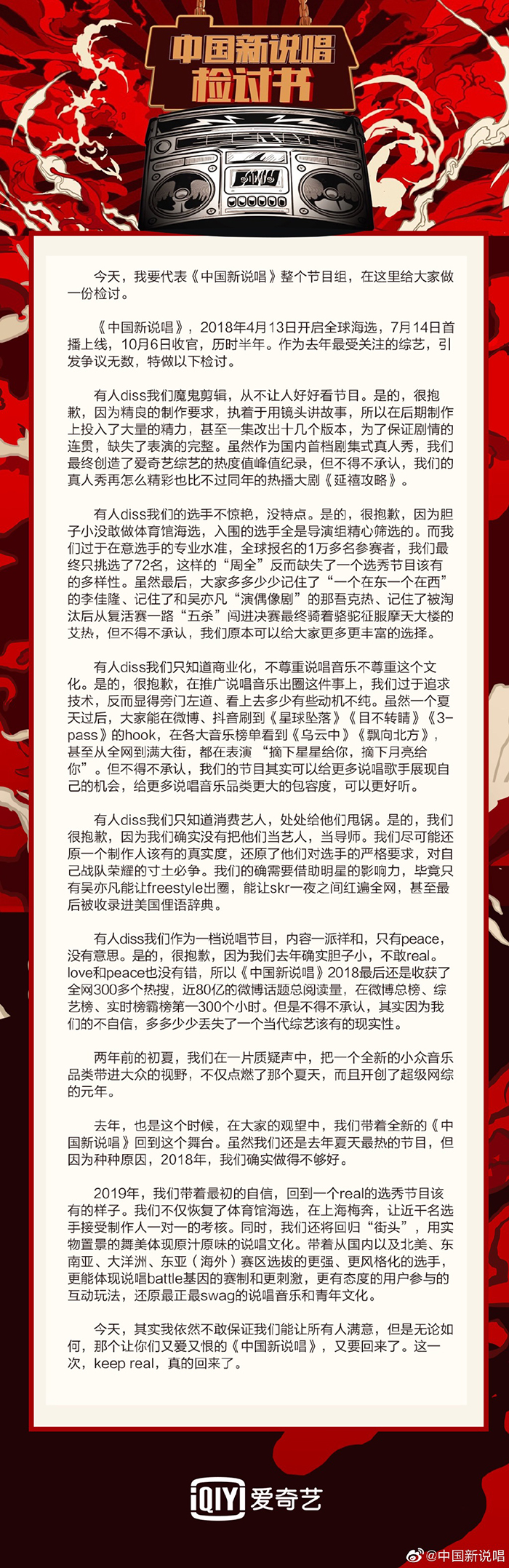 今天,其實我依然不敢保證我們能讓所有人滿意,但是無論如何,那個讓你們又愛又恨的《中國新說唱》,又要回來了。這一次,keep real,真的回來了。