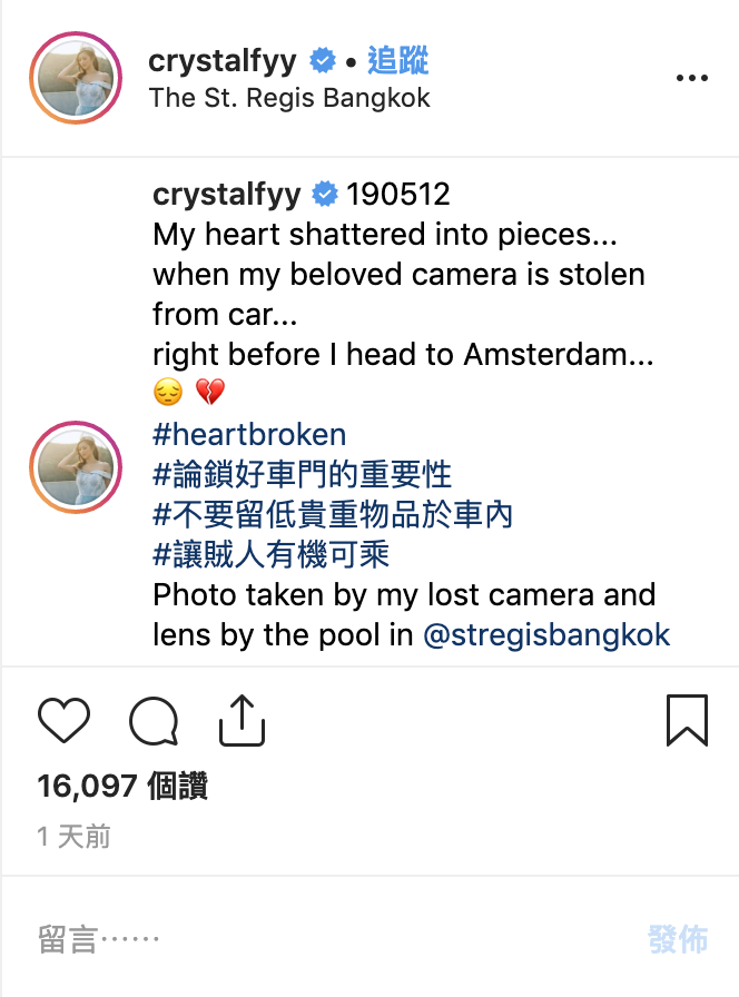 害怕恩愛片外流?「冠軍港姐」相機遭竊「緊急發文」 網:可能會有片流出...