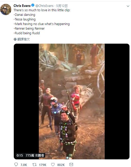 隨著導演羅素兄弟宣布「防雷禁令」解除,「美國隊長」克里斯伊凡就陸續曝光幕後花絮,其中12日公開的影片中,可見英雄們在下戲時,私下彼此互動聊天的畫面。文中,克里斯伊凡也表示「在這短短的影片中有好多的愛」,並一一舉出瓦干達侍衛長「奧科耶」戴娜葛里拉在跳舞,而「女武神」泰莎湯普森則在大笑,另外還笑稱「浩克」馬克盧法洛不知道在幹嘛,「鷹眼」傑瑞米雷納和「蟻人」保羅路德都在演他們自己。
