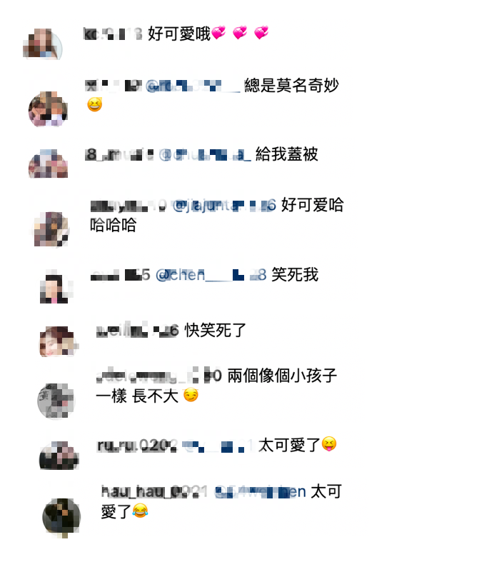 這則影片也被網友下載轉發到IG上,大家看見後也紛紛在下方留言:「兩個像個小孩子一樣 長不大」、「快笑死了」、「好可愛哦」、「好像我喔」、「太熟悉了」,除了這則影片之外,羊羊羊也常常對小可愛講一些撩妹的話,像是:「老婆我感冒了,因為我對妳沒有抵抗力」、「妳怕麻煩嗎?麻煩妳親親我」等撩妹的話都會讓小可愛笑得非常燦爛,也吸引了許多網友觀看。