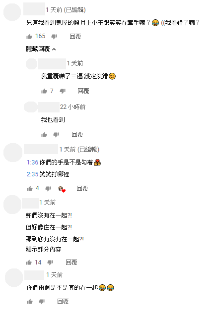 網友紛紛留言:「只有我看到鬼屋的照片上小玉跟笑笑在牽手嘛?」、「我重覆睇了三遍 鐵定沒錯」、「我也為我也看錯了」、「你們的手是不是勾著」、「到底有沒有在一起」,引起熱烈討論,不過笑笑沒有回應。