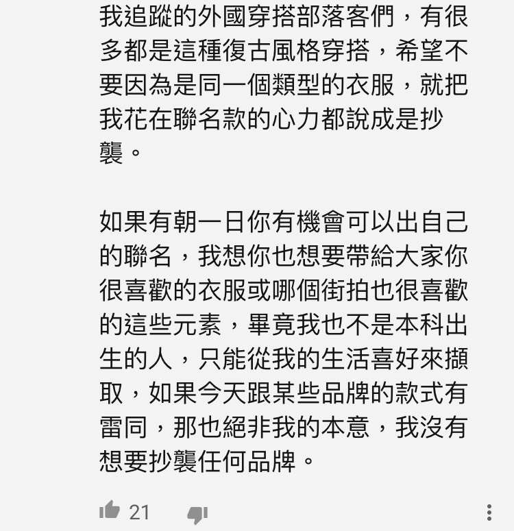 然而,爆料的網友也說,「沒有看到外國網站上有一件裙子這麼像《rouje》」我對於查理有沒有抄襲這件事,抱著的態度是—我相信她沒有。最後他也緩頰的說,算是變相的致敬款吧,我發這篇文的用意是理性討論這件事,沒有公審她的意思,畢竟圖片就擺在那裡,相似程度不高也不會有人提到抄襲。」
