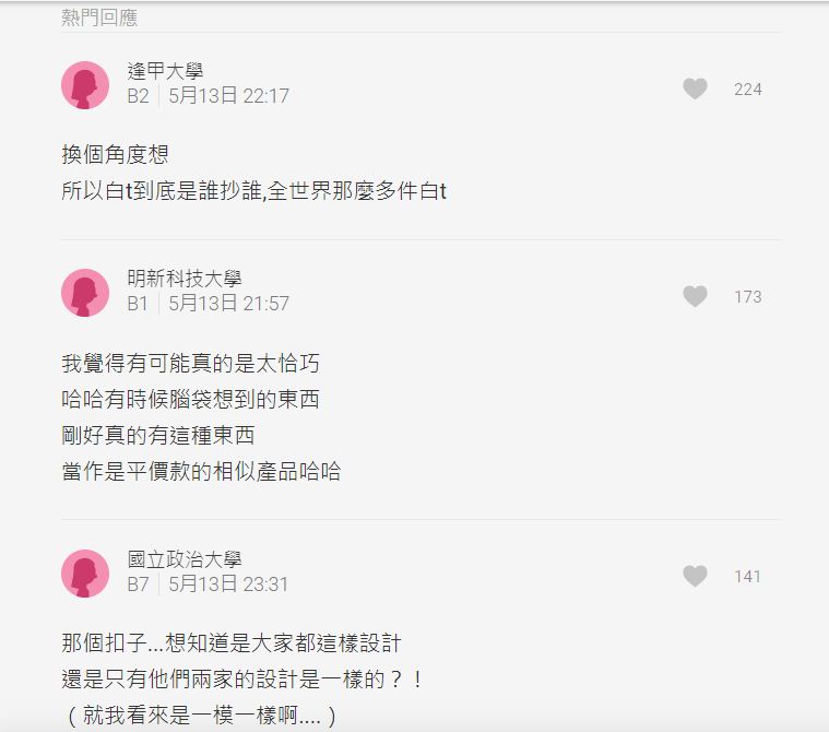 然而,抄襲風波一出,卻引發正反意見討論,並紛紛留言,有網友就認為「鈕扣位置什麼的根本一樣」、「那排扣子弧度整個感覺都太像了」、「太像了,雖然是查理粉 聯名款也很好看 但目前這樣我真的買不下去......」;但也有許多網友認為,衣服款式就這些,說抄襲似乎也太嚴重,並表示,「所以白t到底是誰抄誰,全世界那麼多件白t」、「有時候腦袋想到的東西,剛好真的有這種東西,當作是平價款的相似產品哈哈」、「可能小地方的設計有些參考吧」