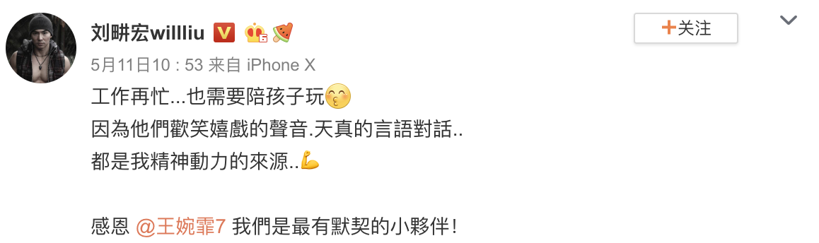 在5月11號時,劉畊宏在微博上發文寫下:「工作再忙...也需要陪孩子玩,因為他們歡笑嬉戲的聲音.天真的言語對話..都是我精神動力的來源..」,並在文末處tag老婆表達感謝之情,劉畊宏也發了全家福的合照,以及小孩們遊玩、游泳的照片,其中小泡芙在背上背了一對粉紅色的蝴蝶翅膀,並在頭上戴著觸角,牽著妹妹的手畫面相當溫馨。