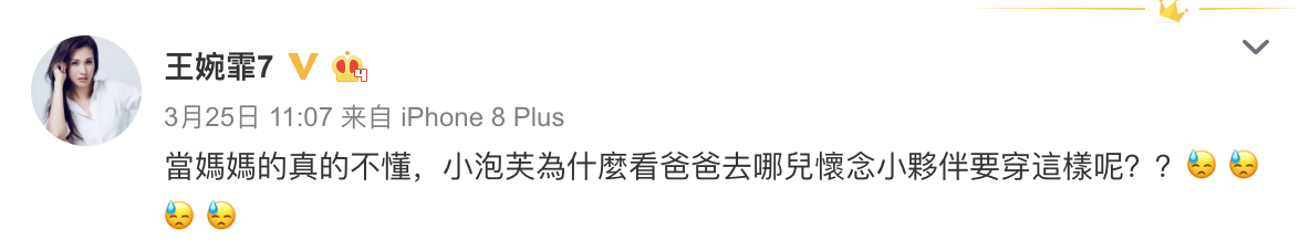 在全家大合照中,小泡芙的身高已經超越了168cm王婉霏的腰部,許多網友也紛紛在留言處大讚小泡芙的高顏值以及大長腿。王婉霏在3月時曾發布一則貼文寫道:「當媽媽的真的不懂,小泡芙為什麼看爸爸去哪兒懷念小夥伴要穿這樣呢??」,照片中小泡芙穿著一件蜘蛛人的套裝,頭上也戴上頭套,前方大螢幕正在播放《爸爸去哪兒5》的片段,可見小泡芙也很想念其他夥伴們。