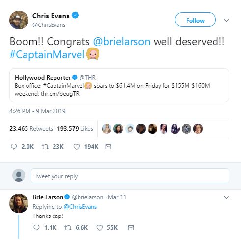 而該媒體也指出,去年3月《驚奇隊長》在美國票房開出紅盤,就連「美國隊長」克里斯伊凡都在推特標記布麗拉森的帳號同時表達恭喜,此外,「終局之戰」世界宣傳在韓國站時,面對情緒激動的布麗拉森,「鋼鐵人」小勞勃道尼甚至擁抱也親吻她的頭表達安慰,讓爆料著的謠言瞬間不攻自破。