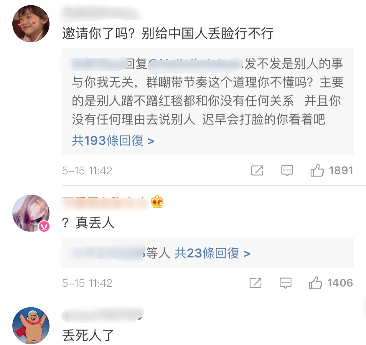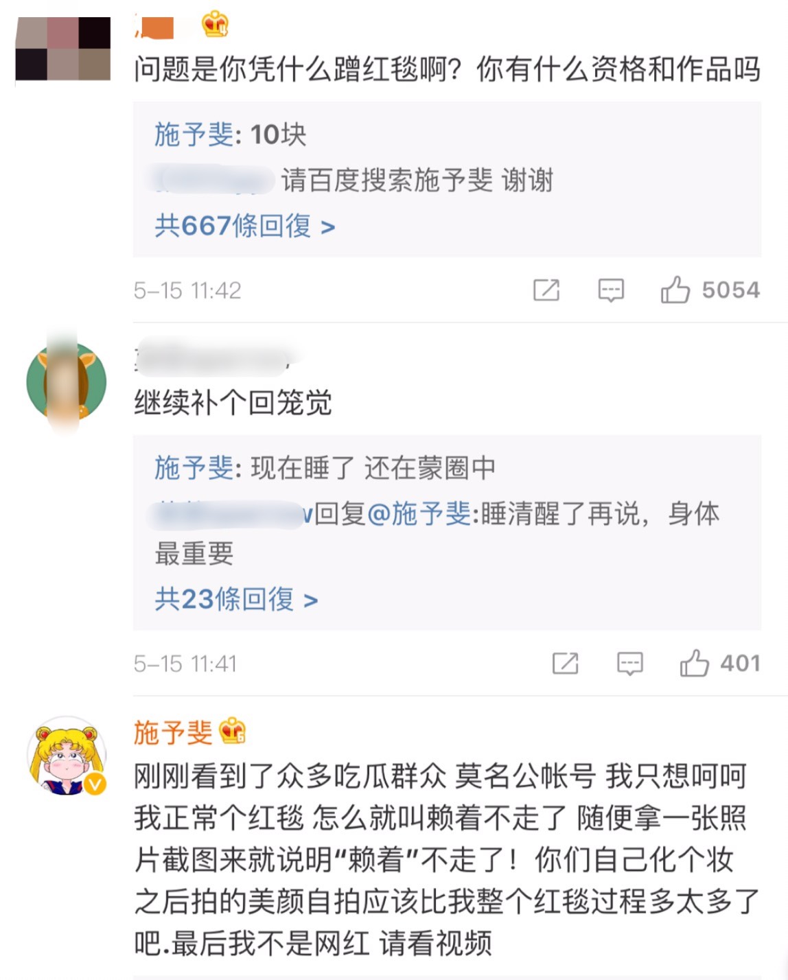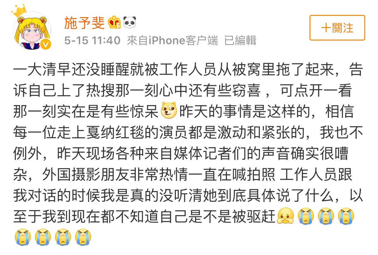 這次網友對她毫不留情的批評「邀請你了嗎?別丟中國人的臉行不行」、「真丟人」、「你憑什麼走紅毯啊?你有什麼資格和作品嗎?」引起廣大迴響,施予斐萬萬也沒想到竟會以這樣的方式登上熱搜,也對此次的事件做出回應了。