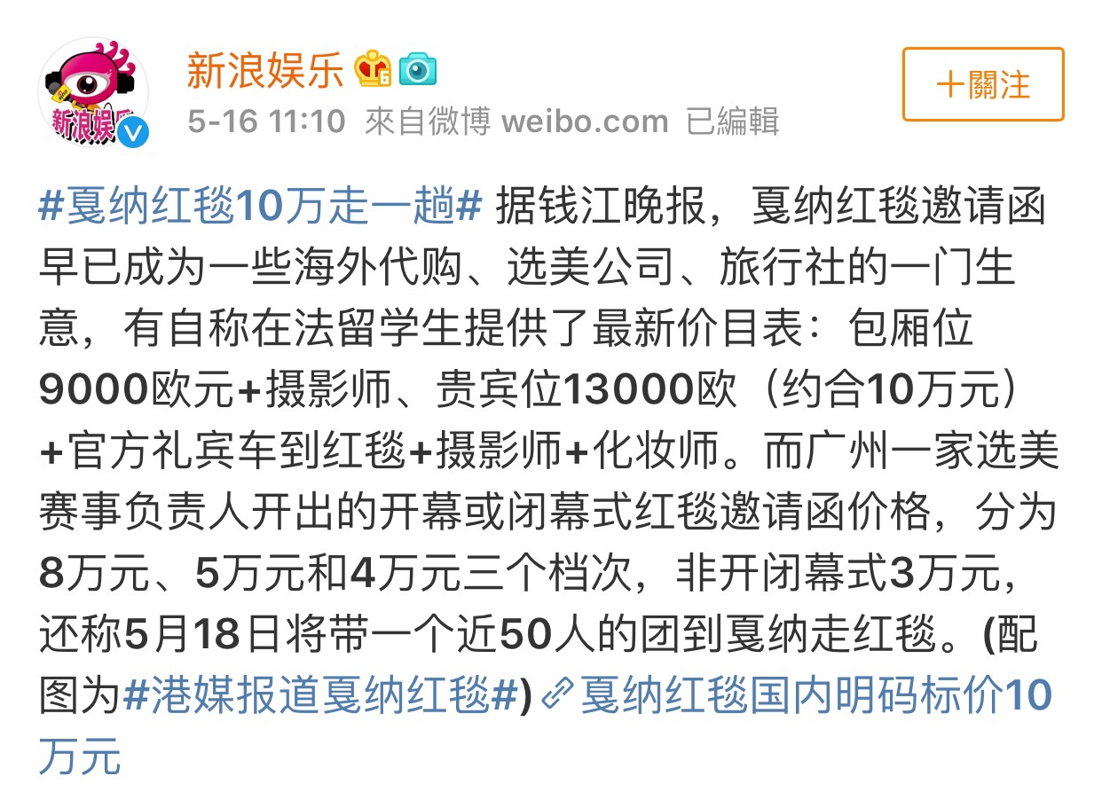 坎城國際影展一直是電影人的一種肯定受到邀請,此時,卻被爆出只要給錢,誰都可以在紅毯上擺Pose拍照,過過癮。根據大陸《錢江晚報》的報導,夏納紅毯早已成為一下海外代購、選美公司、旅行社的一門生意。自稱在法國留學生提供最新價目表,包廂位9000歐元+攝影師、貴賓位13000歐元(官方禮賓車到紅毯+攝影師+化妝師)變成人人只要給錢,都能在紅毯上走秀。