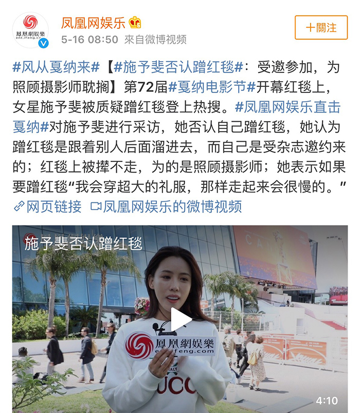 2019年第72屆坎城影展(Cannes Film Festival)於臺灣時間15日凌晨開幕,身為世界第一大國際影展,從開幕式紅毯到各種典禮盛會讓全球電影人齊聚。女星和名模們的紅毯造型更是一大焦點,此次陸媒報導《延禧攻略》高貴妃身旁的宮女「芝蘭」施予斐,在紅毯上竟賴著不走,保全向前告知後,她卻仍然裝聽不懂,繼續在紅毯擺Pose拍照,許多網友看見之後,紛紛評論:「她有什麼資格去坎城影展?」