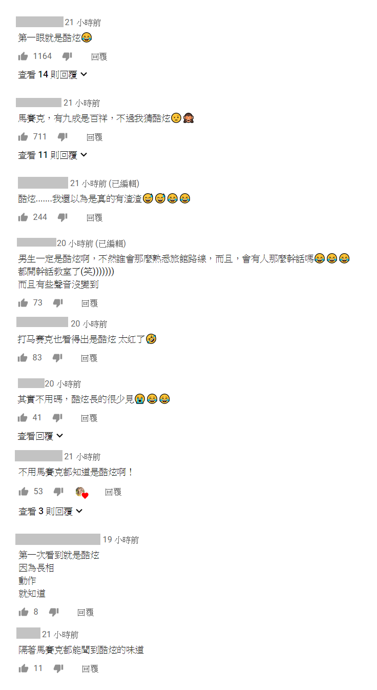 最後,其實影片一開始就可隱約看出這名「知名紅人」其實是反骨的團長「酷炫」,儘管影片一直打著馬賽克,沒有露臉,而許多網友也紛紛留言吐槽「第一眼就是酷炫」、「酷炫.......我還以為是真的有渣渣」、「男生一定是酷炫啊,不然誰會那麼熟悉旅館路線,而且,會有人那麼幹話嗎」、「其實不用碼,酷炫長的很少見」、「隔著馬賽克都能聞到酷炫的味道」,相當地有趣。