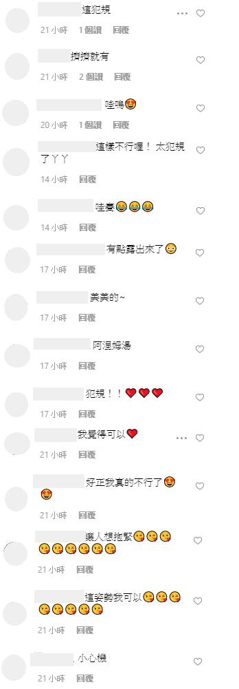 網友見狀也紛紛留言:「很美」、「這犯規」、「這姿勢我可以」「擠擠就有」、「哇嗚」、「有點露出來了」、「美美的~」、「阿涅姆湯」、「有亮點」、「警察叔叔這個人太美了請把她抓來我身邊」、「好正我真的不行了」、「讓人想抱緊」。