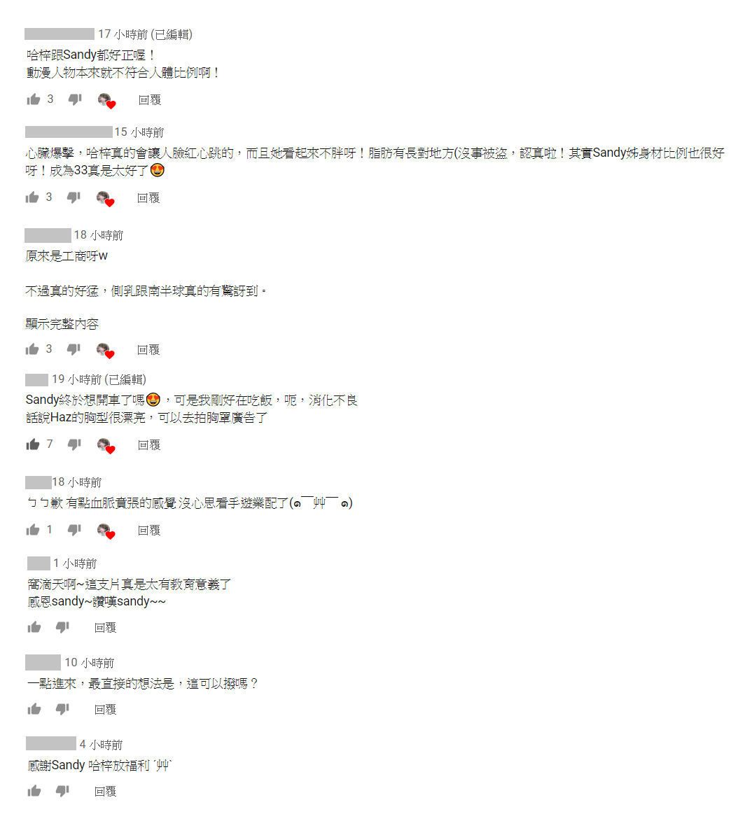 影片最後「Sandy」羞怯地表示「我自己其實很害羞耶」,而網友們看到影片後則紛紛大讚「心臟爆擊,哈梓真的會讓人臉紅心跳的」「側乳跟南半球真的有驚訝到」「感恩sandy~讚嘆sandy~~」「感謝Sandy 哈梓放福利」。