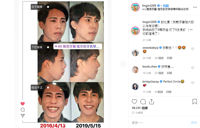 林進隨後更大方公開戴牙套的三年對比圖,只見他三年前因為牙齒參差不齊,導致嘴巴合不攏,更有下巴後縮、咬合不正的問題,不過現在拆掉牙套後,暴牙變得整齊亮白,就連下巴後縮的問題也完全改善,差距明顯,他說明自己總共拔了八顆牙齒,打了六根骨釘,不過如今成果出爐,也讓他感動說道:「一切都值得了」。