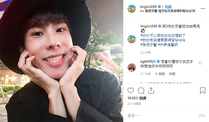 林進昨日在IG分享一張燦爛笑容的照片,「跟3年的牙套朋友說再見」,他也在hashtag打上:「終於可以開始狂吃咖喱飯了」、「我的微笑還需要練習哈哈哈」,從他的限時動態也可以看出他真的期待已久,相當開心地和大家分享。