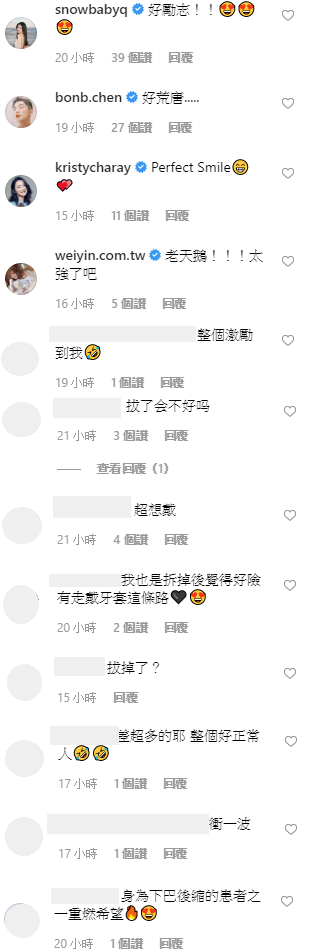 照片上傳之後,許多網友紛紛留言:「超想戴」、「我也是拆掉後覺得好險有走戴牙套這條路」、「整個激勵到我」、「差超多耶,整個好正常」、「好恐怖 8隻牙 6個骨釘」,網紅好友瑞雪也留言:「好勵志!!」