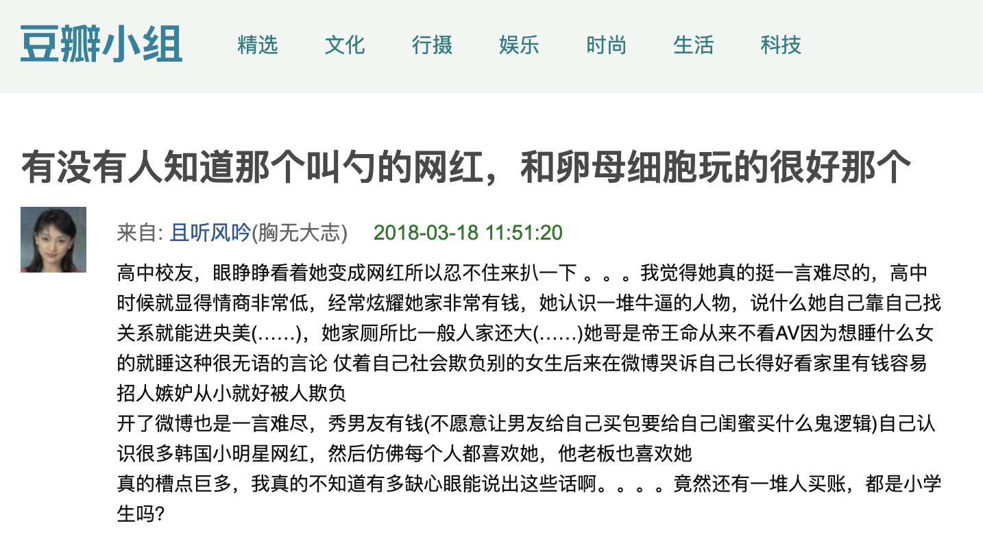 百萬網紅「卵母細胞」過去是因為超高顏值以及傲人的好身材而瞬間爆紅,更被大陸網友們跪求出道,然而在她爆紅之後就有網友翻出過去她疑似整形前的照片,在照片中卵母細胞的眼睛是單眼皮,和現在的照片相比小了許多,當時她年僅十三歲,有著又大又高的額頭。然而看見卵母細胞爆紅之後,她的高中同學在大陸知名論壇上爆料:「我覺得她真的挺一言難盡的,高中時候就顯得情商非常低,經常炫耀她家非常有錢,她認識一堆牛逼的人物。開了微博也是一言難盡,秀男友有錢,然後彷彿每個人都喜歡她」,爆料她非常愛炫富。