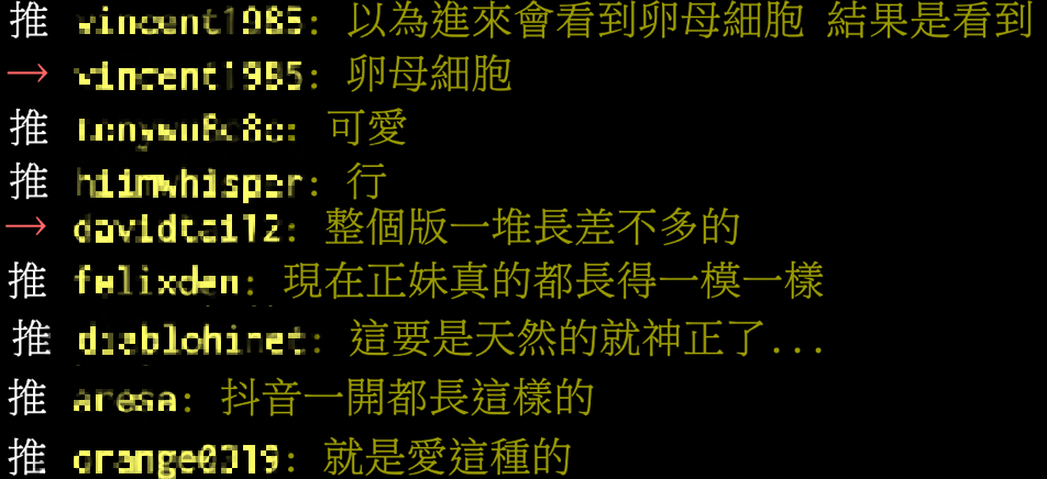然而在12號時,有網友在PTT表特版上貼出卵母細胞的照片,鄉民也紛紛留言表示:「整個版一堆長差不多的」、「現在正妹真的都長得一模一樣」、「我可以」、「這要是天然的就神正了...」、「就是愛這種的」,更有網友搞笑表示:「以為進來會看到卵母細胞(註:生物上的細胞),結果是看到卵母細胞」,該篇貼文也被推爆。