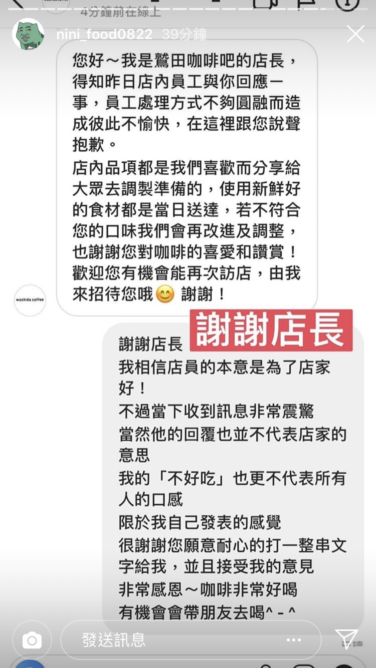 雖然鬧得不太愉快,最後該咖啡廳的店長卻也出面緩頰,「員工處理方式不夠圓融而造成彼此不愉快,在這裡跟您說聲抱歉」,並且表示願意招待妮妮再度前去用餐。妮妮也表示自己知道該店員並不代表店家,「謝謝您願意耐心打易整串文字給我,並且接受我的意見,非常感恩,咖啡非常好喝,有機會會帶朋友去喝」,更打上:「謝謝店長」。