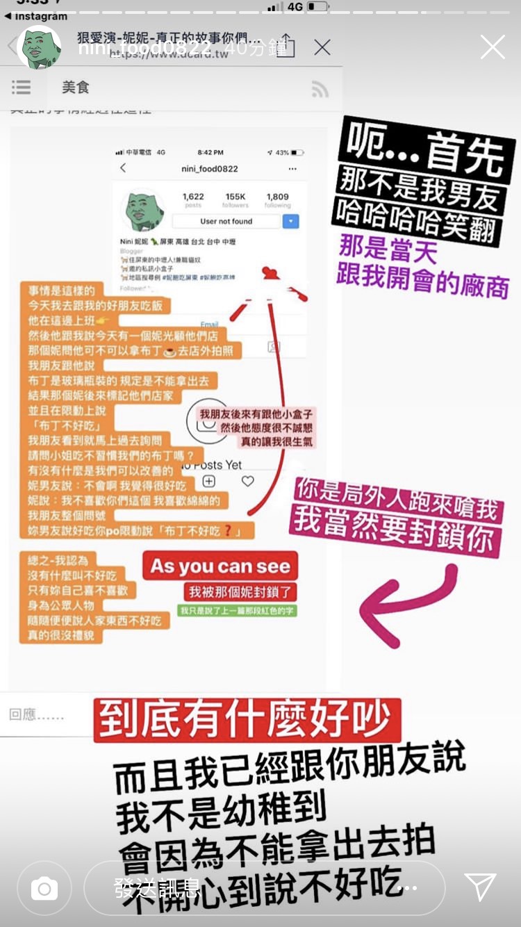妮妮看見文章後,則再度回應「到底有什麼好吵,而且我已經跟你朋友說,我不是幼稚到會因為不能拿出去拍,不開心到說不好吃」,對於被誤會很是無奈;至於封鎖原PO,她則說明:「你是局外人跑來嗆我,我當然封鎖你」,此外因為原PO誤以為妮妮同行的人是她男友,妮妮也特別澄清同行的人其實是廠商。