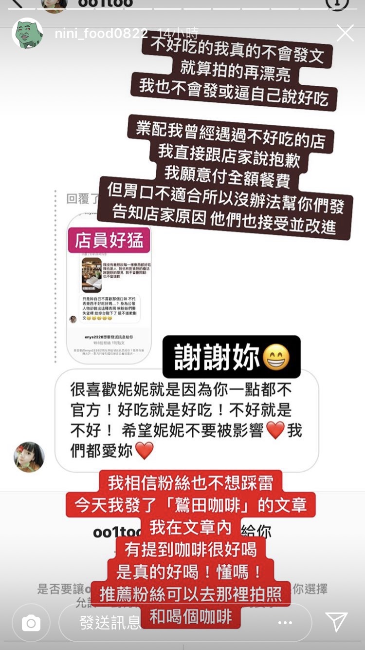 妮妮公開對話截圖,並且表示自己沒有義務說每樣東西都好吃,「我也有對食物的看法,謝謝你的意見,我不會刪限動也不會道歉」,她也打上:「店員好猛」,十分無奈。她也另外解釋這家咖啡廳的咖啡是好喝的,只是自己認為不好吃的東西就不會違背良心說謊,「就算拍得再漂亮,我也不會發或逼自己說好吃」。
