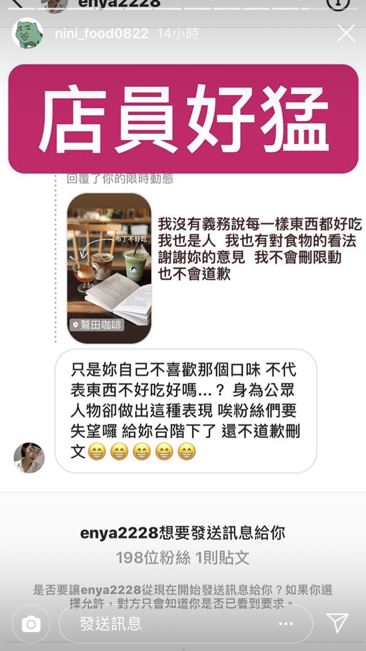 昨妮妮至台南知名咖啡廳「鷲田咖啡」用餐,也特別發文介紹,大讚咖啡廳風格可愛、咖啡好喝,不過同時卻也在限時動態中打上:「布丁不好吃」。沒想到動態發布後,卻引起該店家的店員不滿,私訊妮妮:「只是你自己不喜歡那個口味,不代表東西不好吃好嗎?身為公眾人物卻做出這種表現,唉粉絲們要失望囉!給你台階下囉,還不刪文道歉」,因為態度不佳也讓妮妮看了相當傻眼。