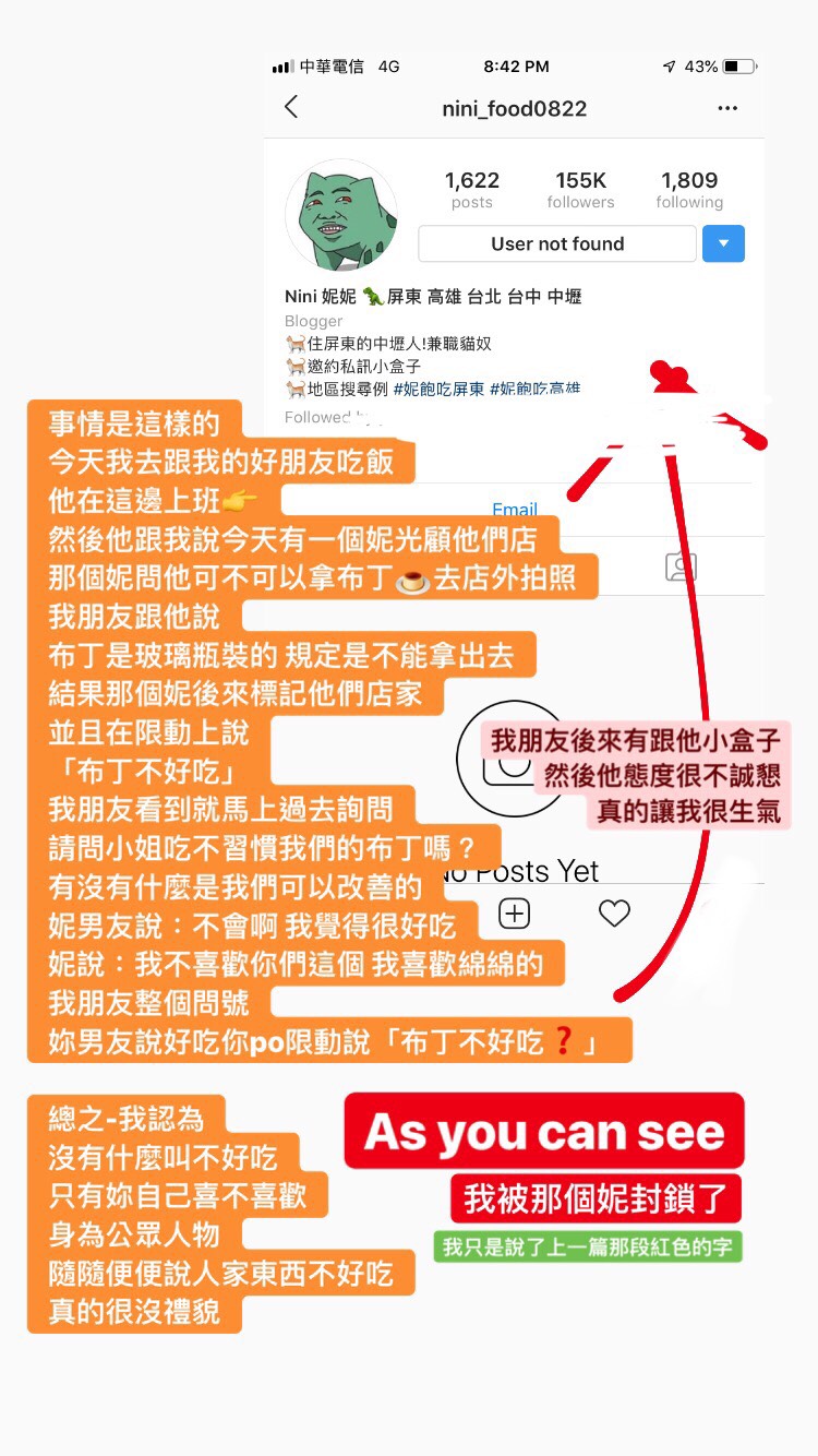 美食網美「妮妮」是知名網紅「牛排」的女朋友,而她自己經營的IG中,則分享許多高屏地區的美食,用心的照片及介紹加上她亮眼可愛的外型,讓她坐擁15萬粉絲追蹤。不過近日妮妮到知名咖啡廳用餐,發文表示「布丁不好吃」,怎料竟被店員私訊狠嗆。