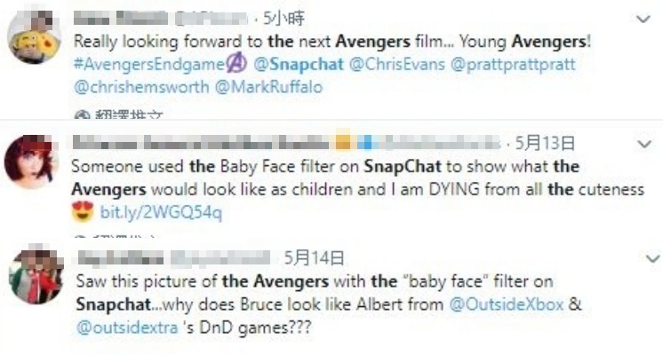 漫威英雄電影《復仇者聯盟4:終局之戰》上影超過兩周,除了日本以外,在各個國家都登上票房冠軍,隨著電影討論度不斷發酵,外界更從討論劇情內容到歪樓談起花邊話題,近期因為手機App「Snap Chat」裡「嬰兒濾鏡」爆紅,推特上有不少網友替出代復仇者們套上「嬰兒濾鏡」,更笑稱「下一集就是新世代的復仇者」。