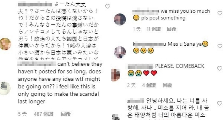 女團TWICE日籍成員Sana,上月底在官方IG一篇感嘆日本揮別舊時代的文章,無辜挑起日韓兩國歷史情結,在大批網友以「#WeloveyouSana」聲援且有成員陪伴下,Sana的心情終於平復。Sana的貼文至今已經湧入超過147萬名網友按讚表達支持,同時因為罕見超過2周沒有更新文章,也有網友出面表達關心並說到「還好嗎已經很久沒發文了」、「好想念你們」。