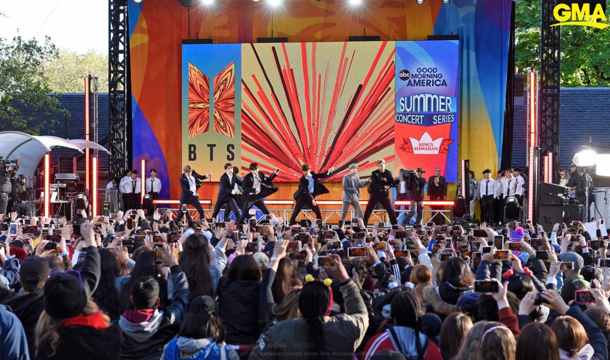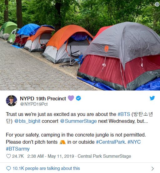 男團防彈少年團,美國時間15日現身晨間節目《早安美國 Good Morning American》(簡稱GMA),並在中央公園舉辦戶外演唱會,根據美媒報導,大批粉絲早在上周就已經在公園內外架設帳篷,想擠進最好的位置一睹BTS的風采,為阻止追星亂象,當地警方也在推特發文阻止粉絲露宿公園,並說到「我們跟你們一樣對BTS下周三的演唱會感到興奮,不過為了您的安全,請不要再水泥叢林裡架設帳篷」。