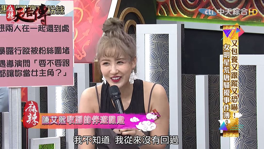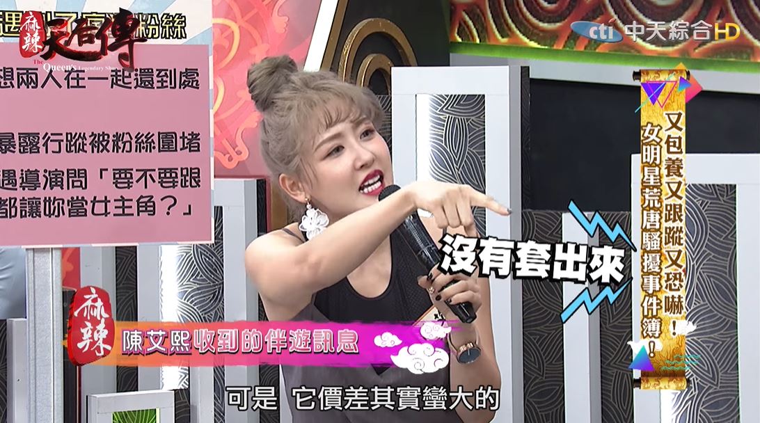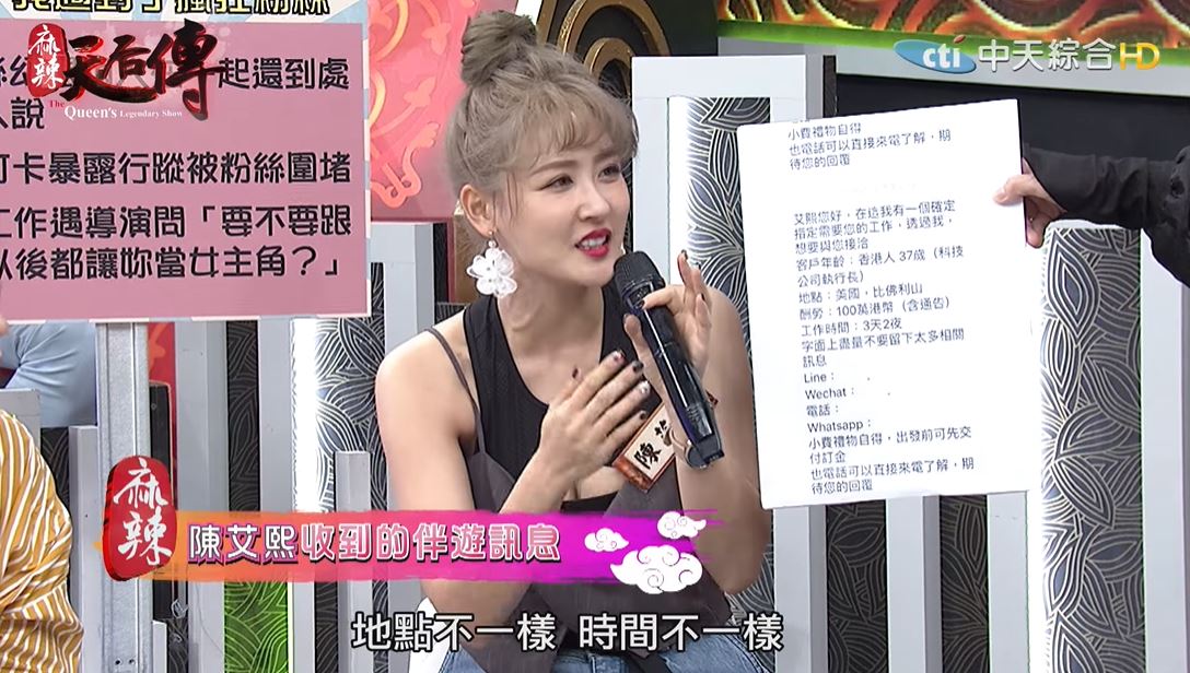 「微風女神」陳艾熙,過去曾是《大學生了沒》的固定班底,先前她曾在《麻辣天后傳》公開自己收到的伴遊訊息,對方是一名科技公司的執行長,伴遊3天2夜開價100萬港幣,相當於將近400萬元台幣左右,讓全場來賓聽了一陣驚呼。利菁接著問:「他們抽多少」,陳艾希透露自己沒有回過訊息,讓利菁笑說:「沒有套出來!」